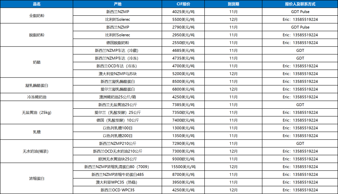 5. 国内主要企业动态:国内主要茶饮企业锁定四季度国产粉大单,中标价钱25000元每吨傍边;乳业龙头加速购买入口粉招标下周预测招标1500吨入口全脂奶粉。